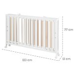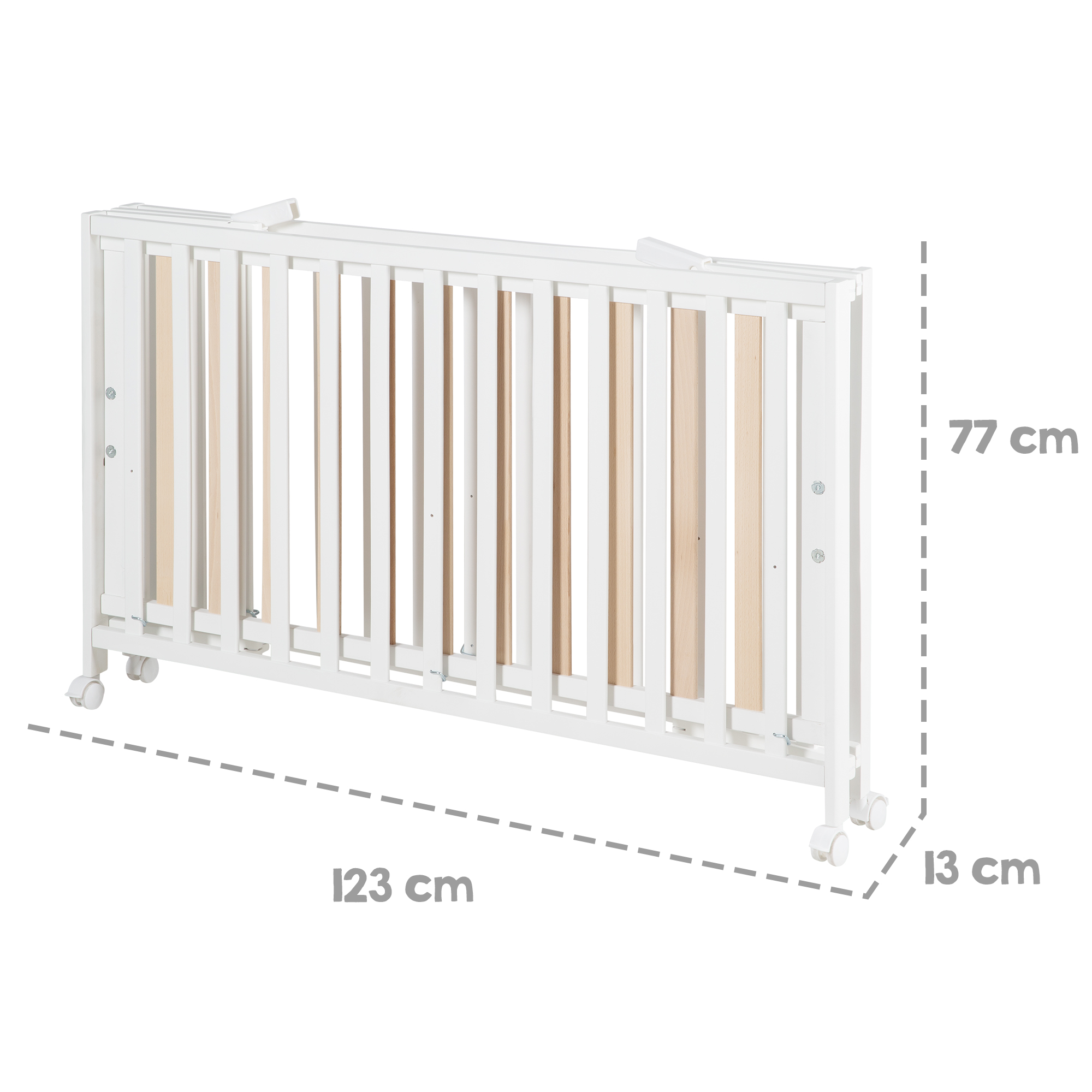 Un lettino di qualità, in resistente e duraturo legno di faggio, dotato di comode ruote con sblocco di sicurezza, per essere posizionato con semplicità.