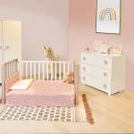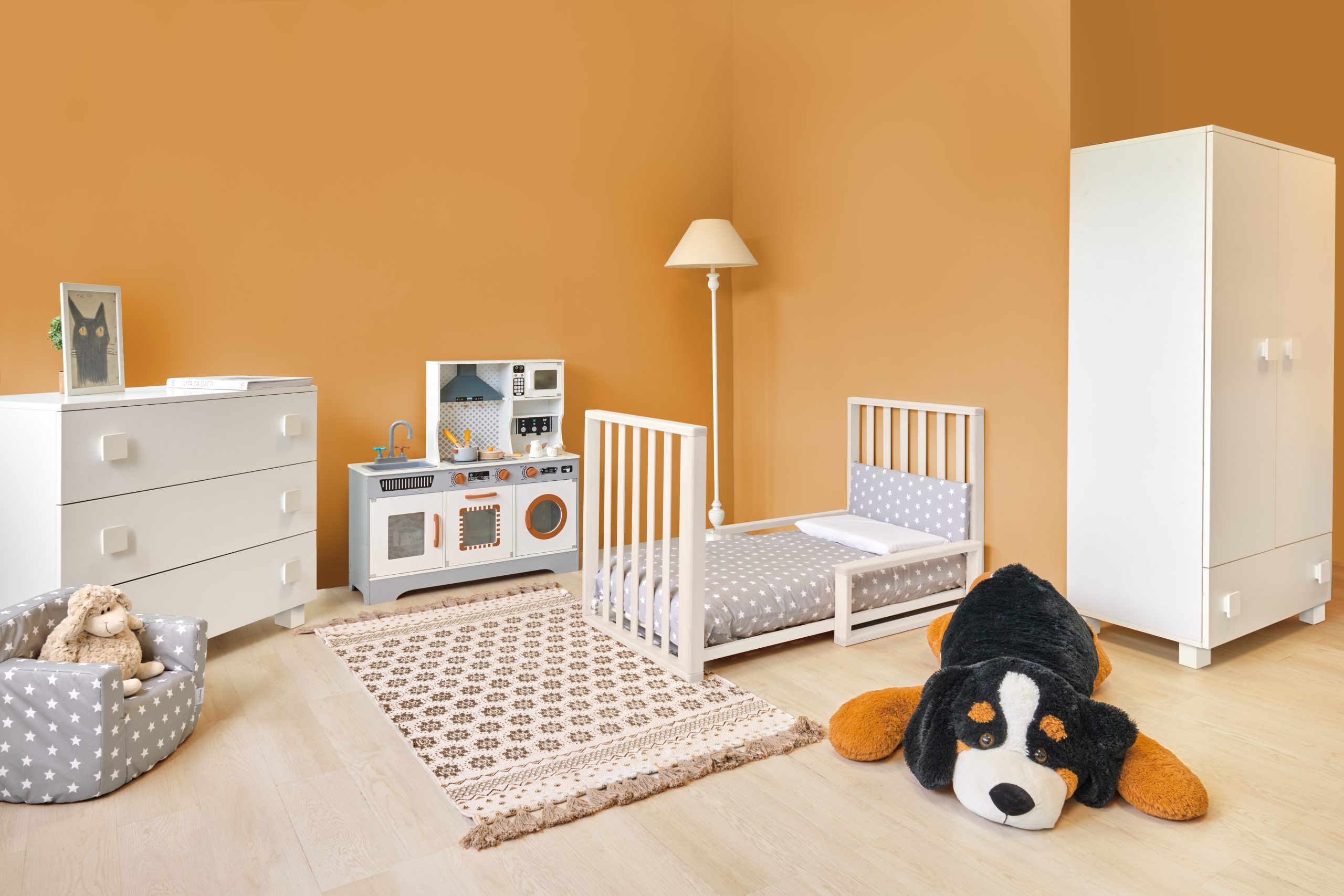 Utilizzo evolutivo montessoriano per la massima libertà di movimento del bambino. Sponda alta per un posizionamento del letto anche in centro stanza e con spondina bassa di sicurezza.
