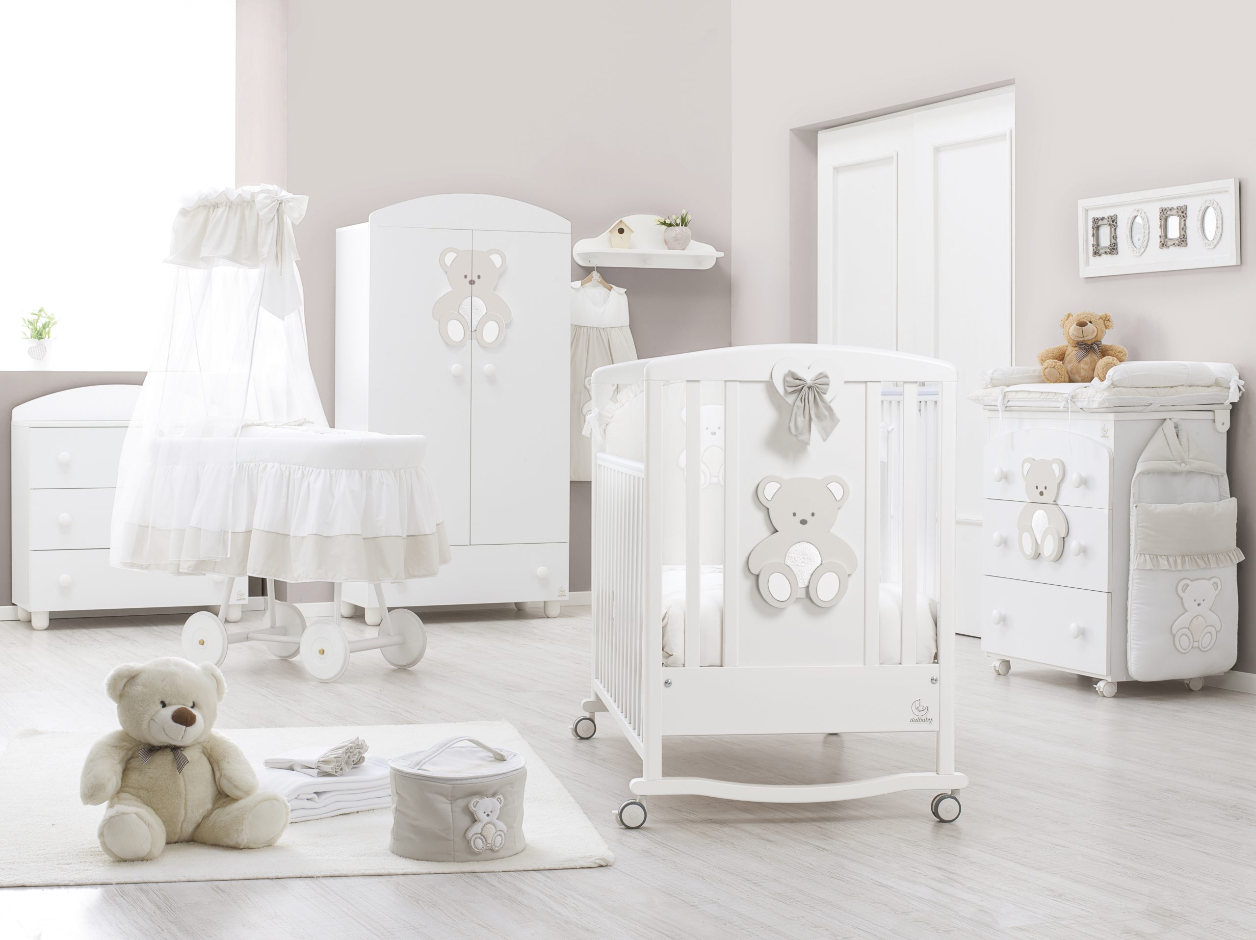 Non solo il lettino, ma l’intera cameretta è impreziosita da questi decori ricchi di dettagli: realizzati su più livelli tridimensionali, gli orsacchiotti prendono vita anche sul bagnetto e l’armadio Italbaby coordinati.