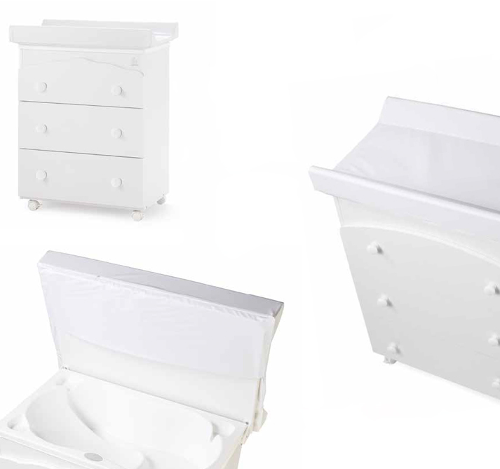 All’apparenza, un comodo fasciatoio con cassettiera. Bello, solido e funzionale, grazie alle dimensioni ottimizzate e alle ruote piro-ettanti e frenanti. Ma basta sollevare il piano fasciatoio, per sco-prire la prima SPA per il tuo piccolo!Il piano fasciatoio è infatti ribaltabile, grazie alle cerniere di sicurezza; All’interno, l’intelligente vaschetta da bagno evolve secondo le esigenze del bambino: il lato sinistro, con forma ergonomica, accoglie nel pieno comfort il corpo del neonato; il lato destro, invece, è concepito per ospitare il bimbo quando starà seduto; La vaschetta è anche dotata di spazi portasapone: tutto in questa SPA è a portata di mano!