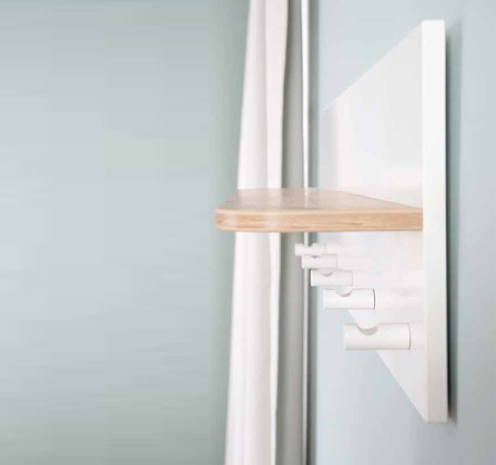 Con piani d’appoggio, ma anche pratici ganci, svolgono la doppia azione di bacheca portaoggetti e appendiabiti, rispettando l’armonia di qualunque arredamento, grazie ai colori neutri. Disponibili in colore bianco, o bianco e legno naturale.