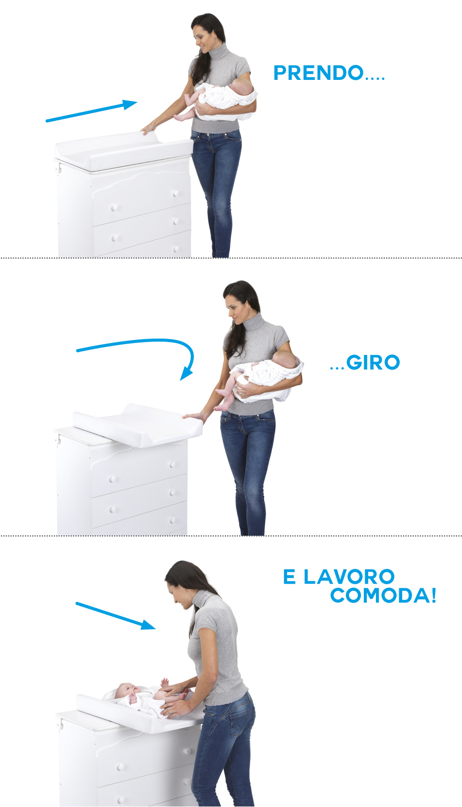 Italbaby, azienda sempre attenta alle esigenze delle mamme e alla qualità dei suoi prodotti, propone una rivoluzionaria novità: la cassettiera-bagnetto con sistema fasciatoio “EASY DRESS”.