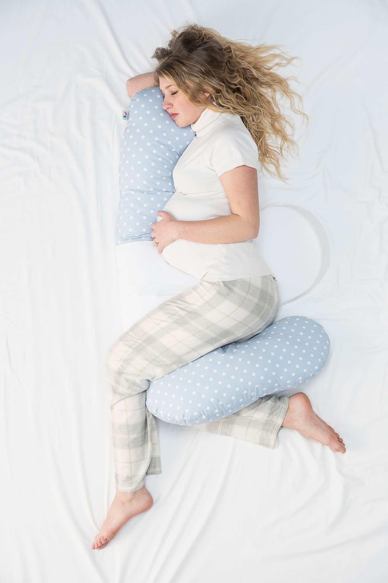 1. In posizione laterale, sul fianco sinistro, la mamma abbraccia il cuscino, appoggiando la testa sull'estremità perpendicolare. Il cuscino a cuneo va sistemato a protezione lombare.