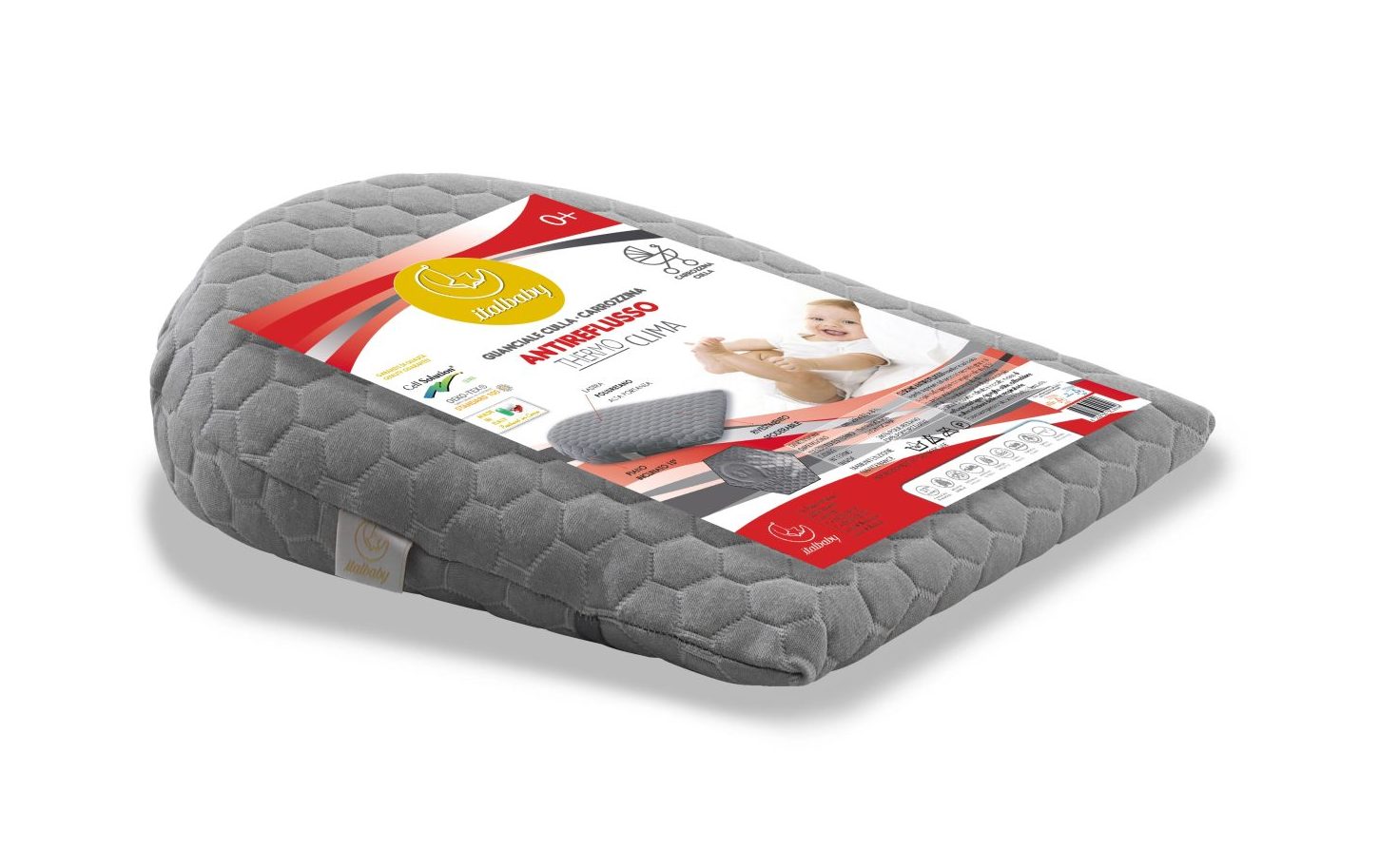 Con la sua particolare inclinazione di 15°, il GUANCIALE ANTIREFLUSSO previene il reflusso esofageo, aiutando la respirazione e la digestione del bambino durante il sonno.
